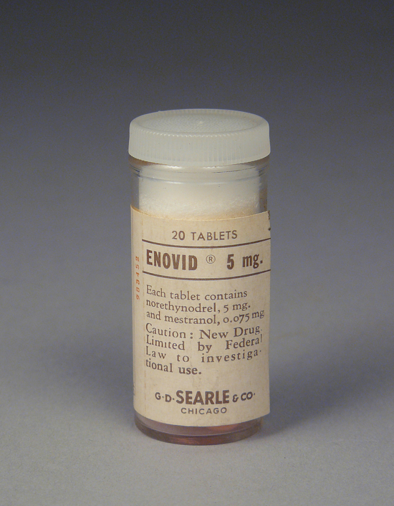 The first oral contraceptive, Enovid, (a.k.a. "the pill") contained 10,000 micrograms of progestin and 150 micrograms of estrogen, two hormones that worked together to prevent pregnancy by stopping ovulation. It originally came in twenty tablet vials. Later, packaging that would help women to remember to take their pill was introduced. One of the key features of this packaging was its clock dial design, which allowed women to more easily keep track of their doses, even if they were illiterate.